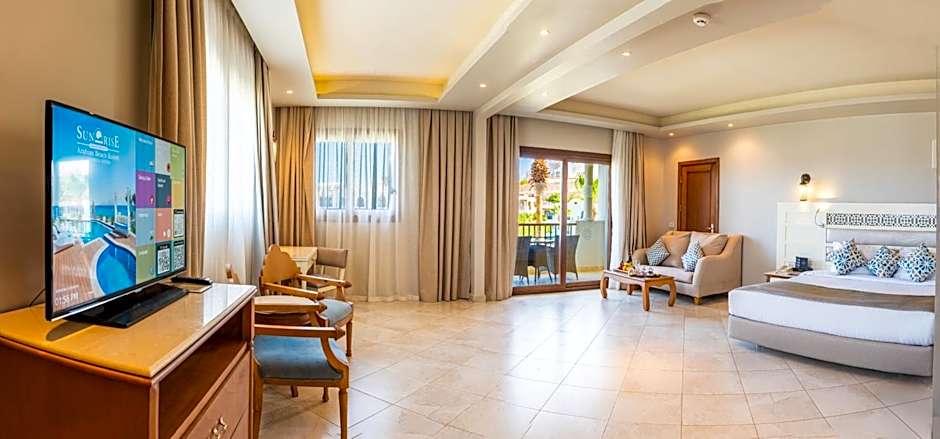 Deluxe spacious bedroom with a king size bed or 2 double beds, with air-conditioning, balcony or terrace with partial sea view. The room features as well a small seating area with LCD SAT-TV, direct-dial telephone as well as mini bar with free mineral water as well as coffee and tea making facilities, large wardrobe with free safe box. The private bathroom has a shower, hairdryer, make-up / shaving mirror and free toiletries.